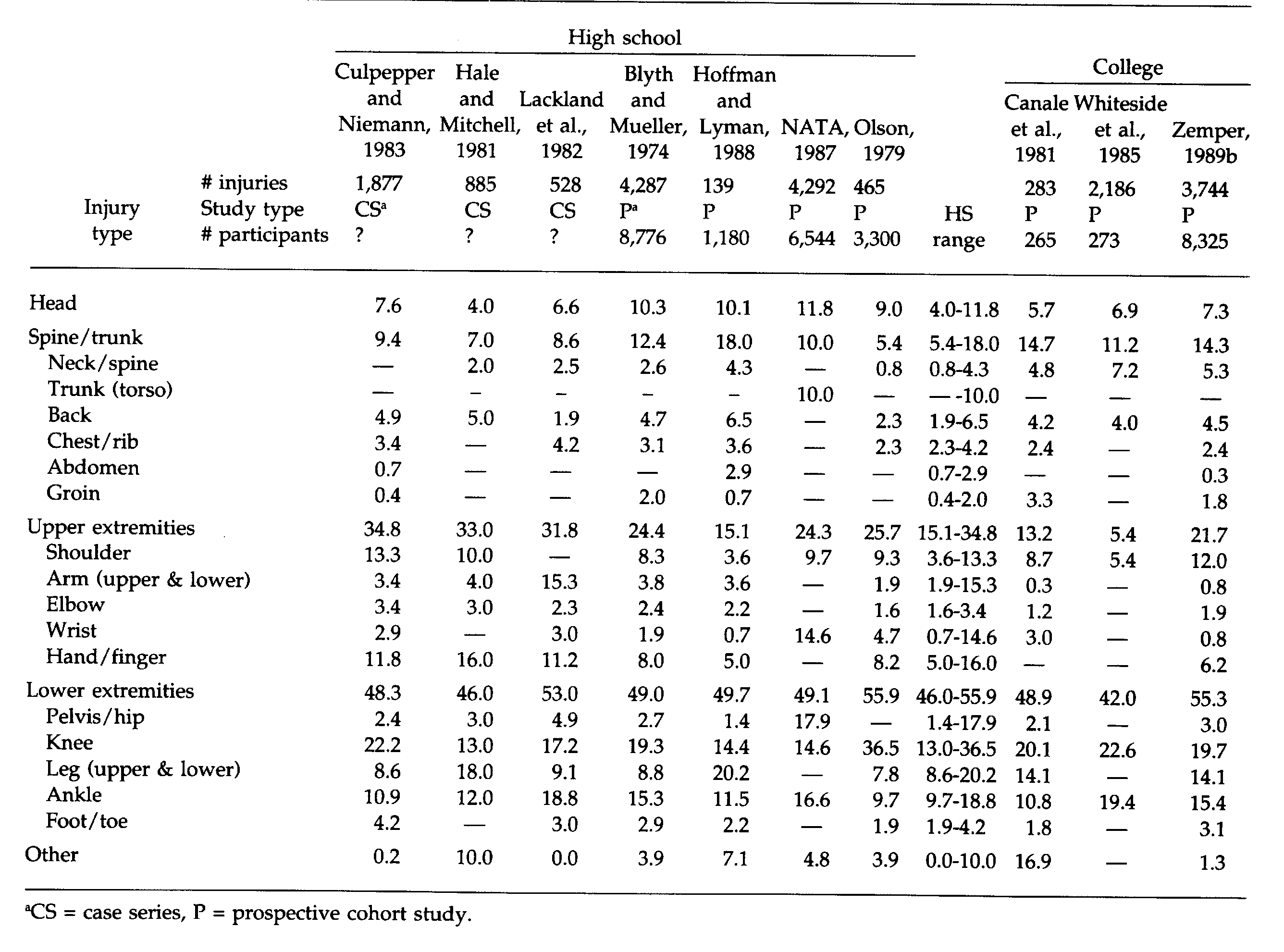 While reviewing these studies, it became clear that injury rates were calculated differently across different studies and the definition of a reportable injury varied widely. Any attempt to compare across studies, therefore, was very difficult and, in most cases, meaningless unless they happened to be using similar rates and definitions. Those reporting high school data tended to report their injury distributions as a percentage of the total number of injuries recorded or as the number of injuries per 100 players. At the collegiate level most researchers reported their results as injuries per 1,000 athlete-exposures (A-E), in which one A-E is one athlete participating in one game or practice where he is exposed to the possibility of being injured.
