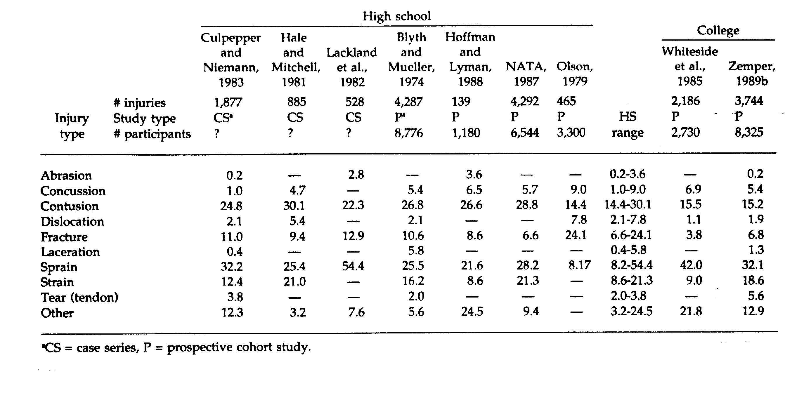 It is apparent from a comparison of the results in Tables 4.1 and 4.2 that when a common injury rate is reported and a common injury definition is used, as most studies at the college level did (Table 4.2), direct comparisons between studies are much easier. This is contrasted with the situation in Table 4.1 in which the high school reports tended to use a less rigorous type of injury rate and a wide variety of definitions of a reportable injury._______________________________________________________________________________________